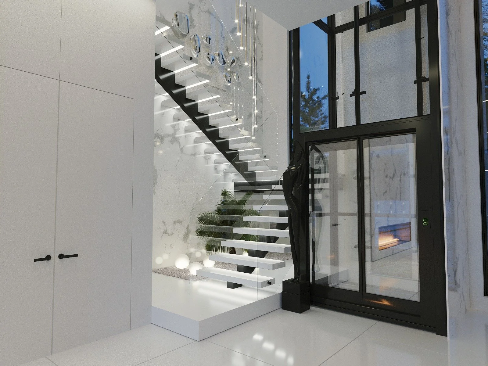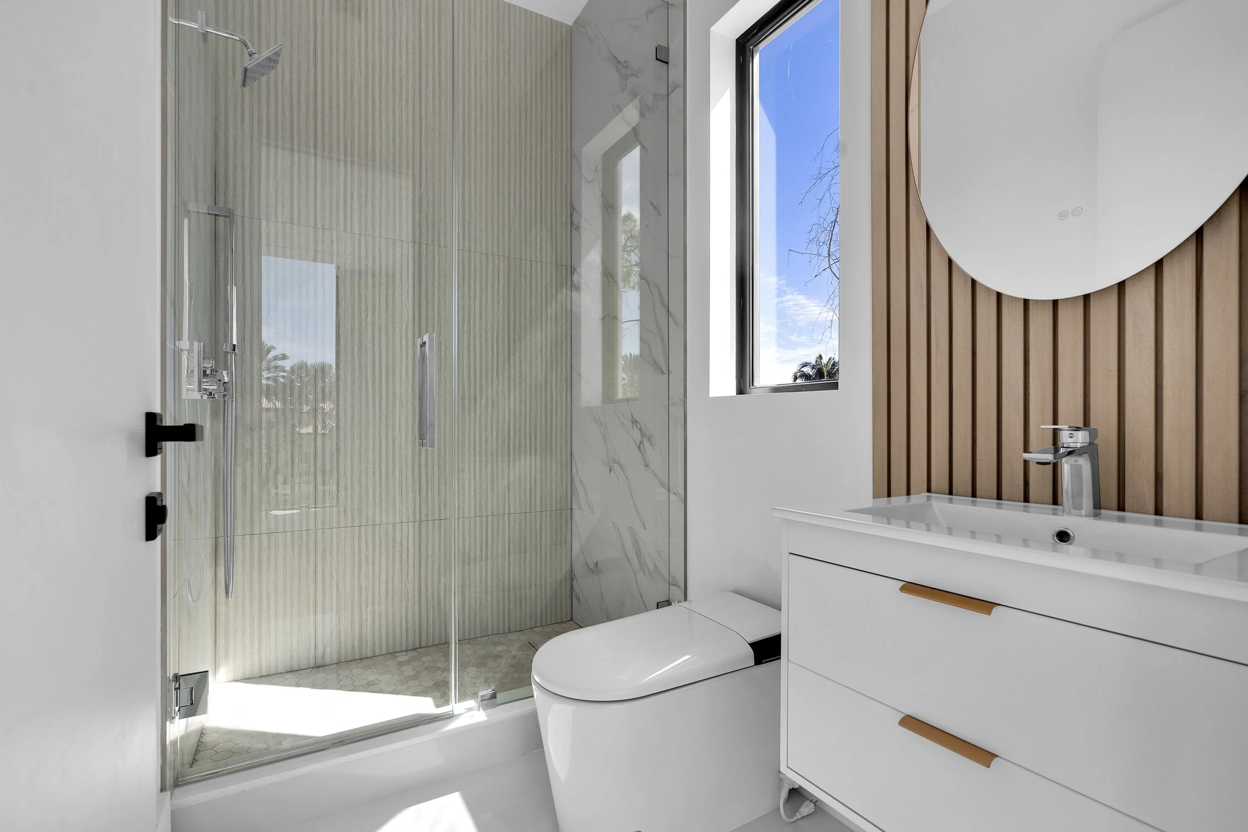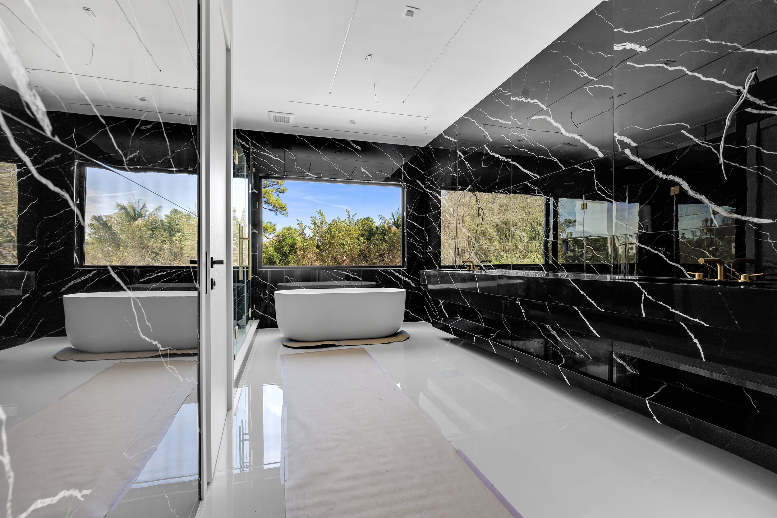The first floor also includes two guest bedrooms with en-suite bathrooms, an office, and a laundry room. Take the elevator or the elegant staircase to the second floor, where you'll find the master suite with a private balcony overlooking the pool, his and hers walk-in closets, and a luxurious bathroom with a soaking tub and a double vanity.